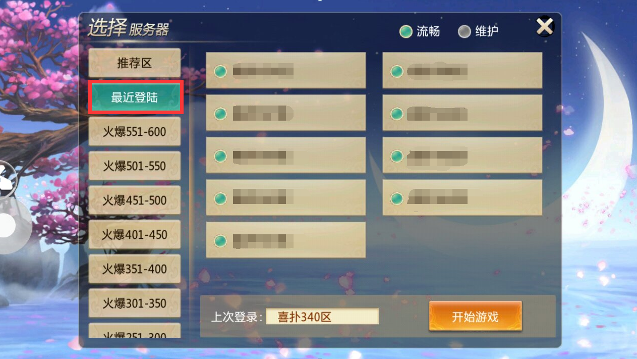 在区服列表中寻找如下图所示右上角有角标[灰色小圆圈]的区服即为建立过角色的区服